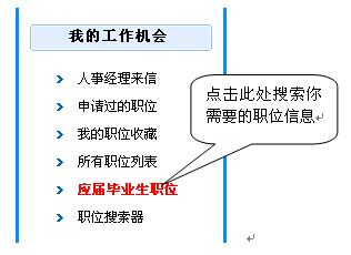 注意:如果你是應(yīng)屆畢業(yè)生可以進入"個人管理中心",位于左側(cè)子欄目的"我的工作機會",點擊"應(yīng)屆畢業(yè)生職位"如下圖所示: