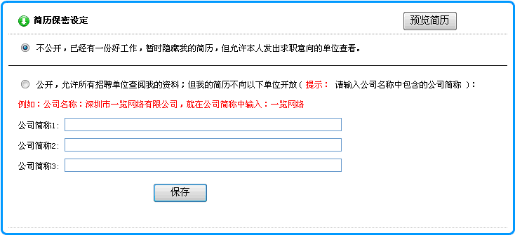 2)在打開的頁面中,選擇 不公開 ( 暫時隱藏我的簡歷,但允許發(fā)出求職意向的單位查看! )后, 點擊"保存"按鈕即可. 如下圖所示: